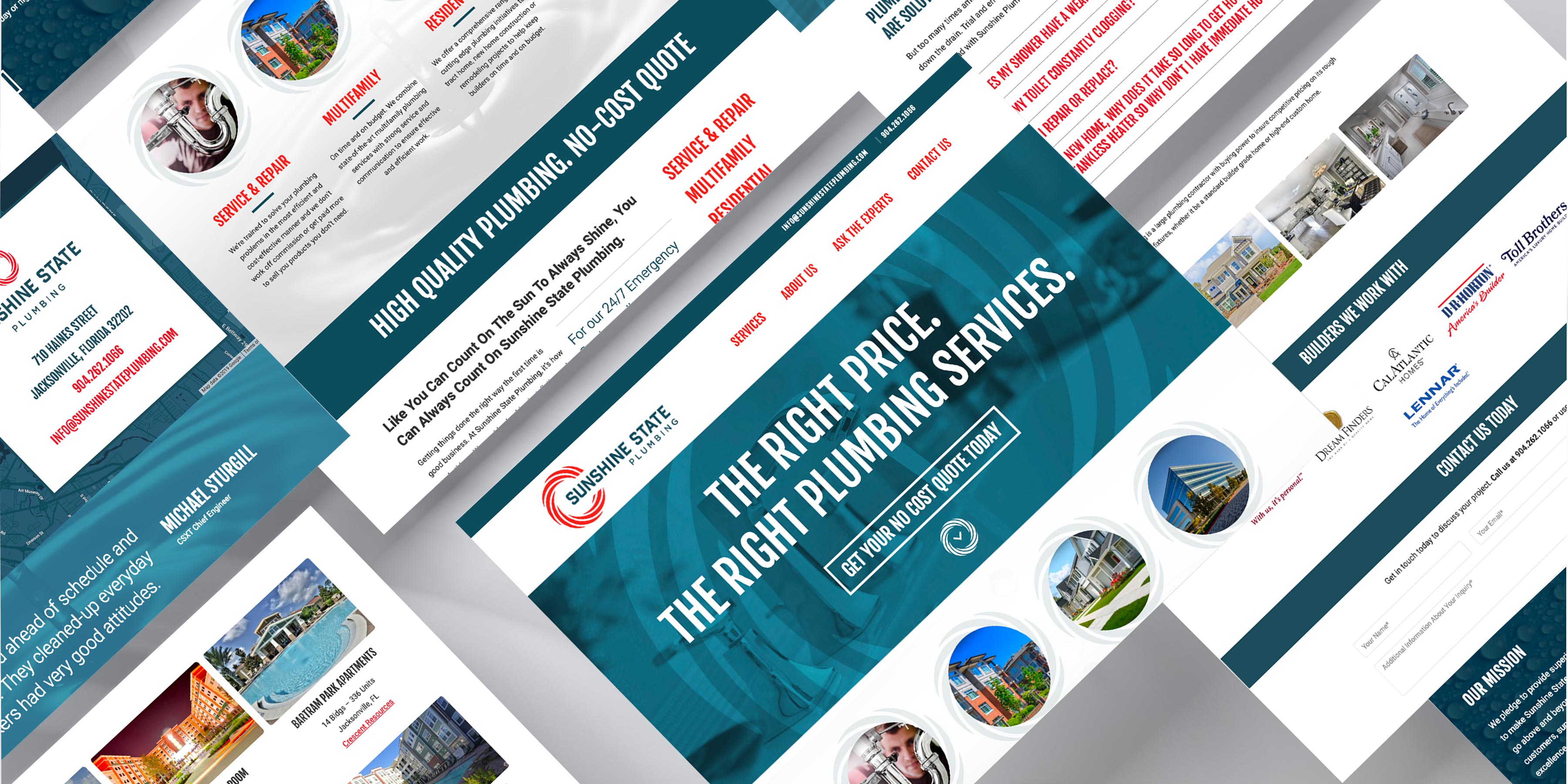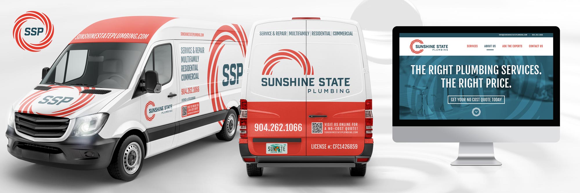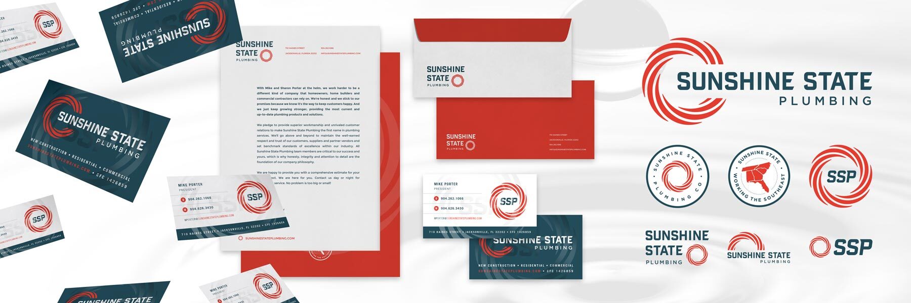 This full brand development package for Sunshine State Plumbing company includes a logo design package, website design and development, vehicle wraps, stationery package, and more. Sunshine State Plumbing focuses on ground up construction projects such as multifamily, single-family residential, and commercial, as well as residential service. For this reason, we wanted to give them a brand that showcases their enterprise level professionalism and boldness. The symbol has a double representation of a sun, as well as a swirling drain pipe, and the colors are bright and solid, representing the power of the sun and the purity of water. Sunshine State pledges to provide superior workmanship and unrivaled customer relations to make them the first name in plumbing services.